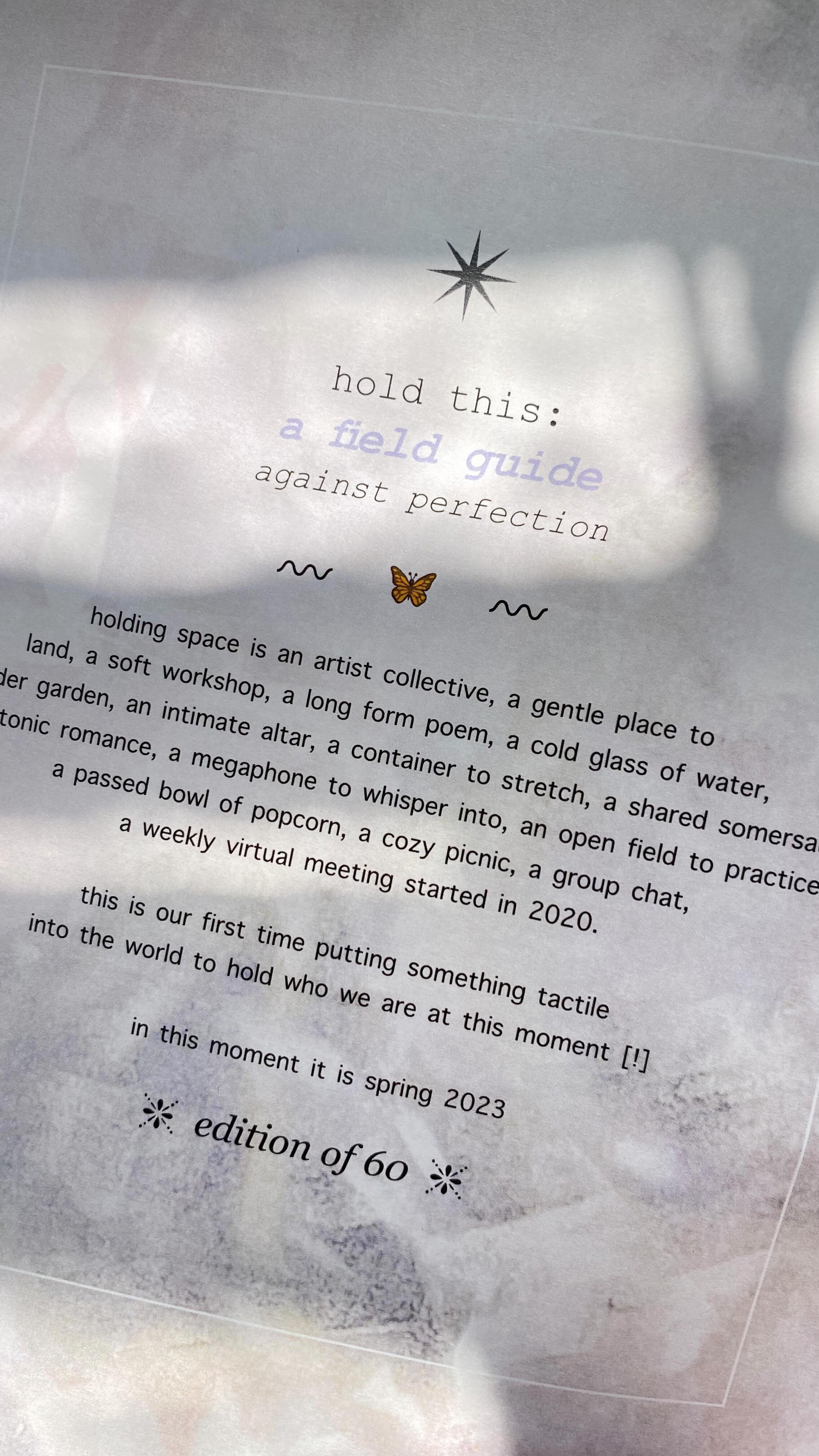 holding space is an artist collective, a gentle place to land, a soft situation, a long form poem, a creativity workshop, a cold glass of water, an intimate altar, a container to stretch, a shared somersault, a platonic romance, a passed bowl of popcorn, a cozy picnic, a group chat.